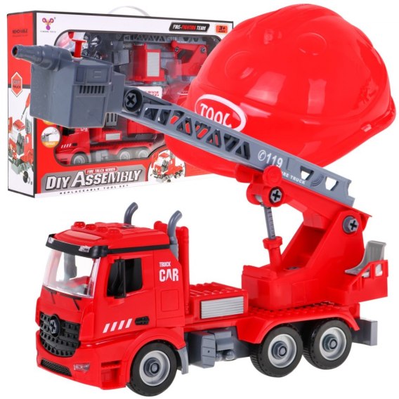 Dla tych chłopców, którzy marzą o tym by zostać strażakiem, mamy znakomity zestaw, auto strażackie 2w1 oraz kask. Zabawka przeznaczona jest dla dzieci od 3-go roku życia. Pojazd strażacki należy złożyć z części konstrukcyjnych, śrubki i narzędzia znajdują się w zestawie. Wóz posiada wymienny, rozsuwalny i obracany o 180 stopni podnośnik z koszem lub rozsuwalną i obracaną drabinę zakończoną armatką wodną, która naprawdę działa. Pojazd strażacki zasilany jest bateriami typu 3 x LR44 które znajdują się w zestawie, posiada funkcje dźwiękowe i świetlne. Wydaje odgłosy syreny, klaksonu czy też odpalania silnika a odgłosom towarzyszą migające światełka. Do zestawu dołączony jest kask, aby Twoja pociecha poczuła się jak prawdziwy strażak. |