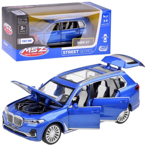 Metalowe autko Suv BMW X7 1:32 to model samochodu przeznaczonego do jazdy miejskiej. Samochód został bardzo starannie i estetycznie wykonany z dbałością o najmniejsze szczegóły, co zapewne zachwyci każdego małego kierowcę. Autko posiada efekty dźwiękowe, świetlne, otwierane drzwi, bagażnik, maskę. Samochód jeździ poprzez cofnięcie zabawki na gładkiej powierzchni do tyłu za pomocą mechanizmu Friction power, czyli rozpędzanie poprzez poruszenie zabawki na gładkiej powierzchni.