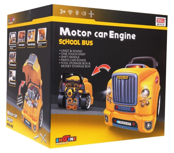 Interaktywna zabawka, przód żółtego autobusu szkolnego z podnoszoną maską oraz deską rozdzielczą przeznaczony dla dzieci od 3-go roku życia. Komplet zawiera części do złożenia przodu autobusu oraz narzędzia potrzebne w montażu i demontażu części takie jak śrubokręt, czy klucze. Pod maską autobusu znajduje się duży rozkręcany silnik, który dziecko może rozłożyć na czynniki pierwsze. Do wymiany nadają się także świece zapłonowe oraz koła. Na desce rozdzielczej znajduje się przycisk startu pojazdu z odgłosami zapalania silnika, kierownica z klaksonem oraz sygnalizator awaryjny. Pod kierownicą umiejscowiony jest schowek, do którego można włożyć wszystkie niezbędne narzędzia, śruby, pokrętła. Zabawka posiada wygodną rączkę do przenoszenia. Zasilanie bateriami typu 3 x AA 1,5 V (brak w zestawie). Zabawka dla małego mechanika rozwija umiejętności manualne, małą motorykę oraz koordynację oko-ręka. Funkcje: - podnoszona maska autobusu, - rozkręcany silnik, - odgłos zapalania silnika, jazdy, cofania, - klakson w kierownicy, - sygnalizator awaryjny, - świecące reflektory, - oświetlenie silnika, - schowek na narzędzia, - drążek zmiany biegów, - wygodna rączka do przenoszenia, - ruchoma kierownica. |