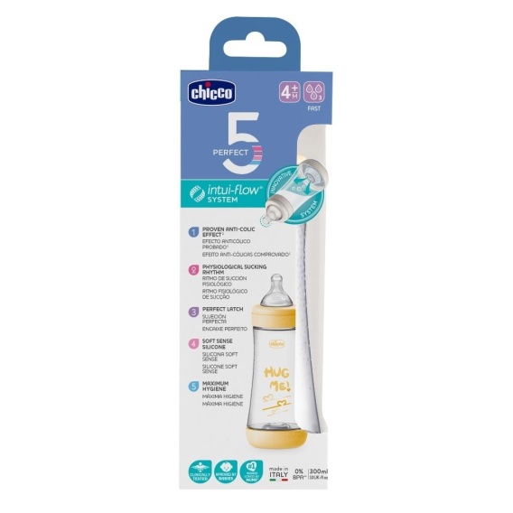 Butelka antykolkowa Chicco Perfect5 Jest odpowiednia dla dzieci już od 4. miesiąca życia Posiada Smoczek Physio ze średnim przepływem oraz membranę EQUILIBRIUM, które zapobiegają połykaniu powietrza w trakcie karmienia, ograniczając epizody kolki*. Perfect5 to biofunkcyjna butelka, która wspiera intuicyjne i fizjologiczne karmienie, dostosowując się do potrzeb dziecka. To wszystko dzięki innowacyjnemu systemowi INTUI-FLOW, który stanowi połączenie membrany EQUILIBRIUM i smoczka PHYSIO. Membrana Equilibrium oraz Smoczek Physio zapobiegają połykaniu powietrza przez dziecko podczas karmienia, zmniejszając w ten sposób drażliwość, epizody ulewania i kolki*. Butelka Chicco Perfect5 to: Potwierdzone działanie antykolkowe Membrana Equilibrium oraz Smoczek Physio zapobiegają połykaniu powietrza przez dziecko podczas karmienia, zmniejszając w ten sposób drażliwość, epizody ulewania i kolki - potwierdzone przez 96% mam*. Naturalny przepływ mleka i indywidualny rytm ssania Butelka podąża za unikalnym i fizjologicznym rytmem ssania dziecka, umożliwiając ciągłe i regularne karmienie, bez przerw i duszności. Testowana klinicznie.** Perfekcyjne dopasowanie Smoczek Physio idealnie dopasowuje się do ust dziecka i naśladuje naturalny sposób ssania. Akceptowany przez 9 na 10 niemowląt.* Silikon Soft Sense Miękki i elastyczny smoczek z wykończeniem Soft Sense zapewnia dziecku przyjemne, naturalne odczucia w trakcie ssania. Maksymalna higiena i łatwość czyszczenia Odkręcana podstawa sprawia, że czyszczenie wszystkich części butelki jest łatwe i szybkie. System intui-flow to połączenie membrany Equilibrium i smoczka Physio: Membrana Equilibrium Podczas ssania aktywowana jest Membrana Equilibrium u podstawy butelki, która uwalnia przepływ powietrza, zapobiegając powstawaniu próżni. Dostęp powietrza od podstawy butelki sprawia, że nie miesza się ono z mlekiem i nie jest połykane przez dziecko. Elastyczność dynamicznego zaworu antykolkowego pozwala reagować na mikroruchy w spersonalizowany sposób w zależności od intensywności ssania, na bieżąco dostosowuje się przepływ powietrza, zapewniając płynne i regularne karmienie, bez przerw i duszności. Smoczek Physio Symetryczny, płaski i wydłużony kształt: imituje sutek mamy, który delikatnie zmienia kształt w czasie ssania piersi przez dziecko: smoczek jest wydłużony i poszerzony, aby promować naturalne ruchy języka w trakcie ssania piersi, Łatwość ssania: podąża za fizjologicznym sposobem ssania. Zawór antykolkowy: zlokalizowany u podstawy smoczka zapobiega jego zapadaniu się oraz połykaniu powietrza przez dziecko, zmniejszając w ten sposób epizody kolki, a także umożliwiając płynne, spokojne karmienie. Zawór antykolkowy nie działa po zamontowaniu membrany Equilibrium, która przejmuje jego działanie Silikon Soft Sense: specjalne wykończenie sprawia, że smoczek jest aksamitny i miękki w dotyku, przypominając skórę matki, co zapewnia jeszcze bardziej naturalne i komfortowe ssanie. Wysoka akceptacja: akceptowany przez 9 na 10 niemowląt*. *Testy konsumenckie wśród 450 dzieci, Włochy, 2019 **Badania kliniczne wśród 30 dzieci, Uniwersytet Campus Bio-Medico, Rzym, 2019