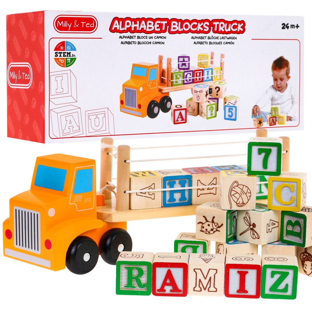 • Drewniana Ciężarówka z Naczepą i Klockami dla dzieci 2+ Zabawka edukacyjna + Klocki z literami cyframi