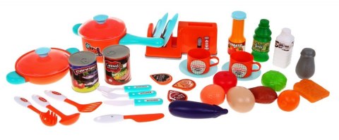 | - kuchnia z kranem, piekarnikiem, półeczkami, płytą do gotowania, - toster ok. 8,5 cm x 7 cm x 7 cm, - naklejki do samodzielnego ozdobienia kuchni, - garnek z pokrywką ok. 9 cm x 11 cm x 22 cm, - patelnia z pokrywką ok. 7 cm x 12 cm x 17 cm, - talerzyk średnica ok. 8 cm, - 2 x kubeczek ok. 4 cm x 4,5 cm, - butelka z mlekiem ok. 8,5 cm x 3 cm, - butelka z kwaskiem cytrynowym ok. 9 cm x 4 cm, - butelka z sosem pomidorowym ok. 10 cm x 4,5 cm, - puszka konserwy ok. 6,5 cm x 5,5 cm, - puszka z sardynkami ok. 6,5 cm x 5 cm, - chochelka, łopatka, cedzak ok. 13 cm x 3,5cm, - mały widelec, nożyk, łyżeczka ok. 11 cm x 2,5 cm, - duży nożyk ok. 13 cm x 2,5 cm, - warzywa (kapusta, pomidor, marchewka, bakłażan), - owoc (pomarańcza), - jajko na twardo, - nóżka z kurczaka, - tost - solniczka ok. 6,5 cm x 4 cm - saszetki kawy czarnej i latte oraz mleka. |