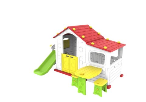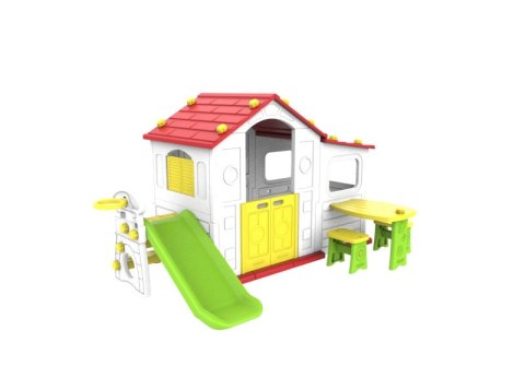 | Specyfikacja | Domek ogrodowy ze zjeżdżalnią, koszykówką oraz ze stolikiem |