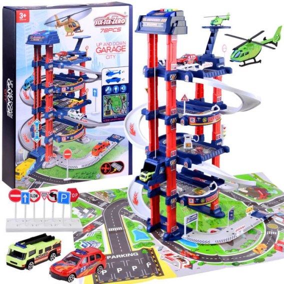 Rewelacyjny wielopoziomowy parking ze stacją benzynową, podnośnikiem, windą, warsztatem samochodowym, lądowiskiem dla helikoptera. Parking przystosowany jest do "resoraków". Za pomocą windy autko może przemieszczać się na poszczególne piętra parkingu. Jeśli braknie benzyny bez problemu zatankujesz na stacji benzynowej. Gdy chcesz naprawić swój samochód skorzystaj z podnośnika, dzięki któremu naprawisz zawieszenie czy zmienisz oponę. Zestaw zawiera wiele dodatkowych elementów wspaniale urozmaicających zabawę, takich jak znaki drogowe, pachołki. Sklep Jokomisiada oferuje szeroki wybór zabawek z serii tory, autka, parking, garaż.