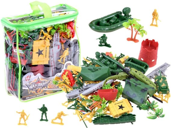 Mocno rozbudowany zestaw żołnierzyków do zabawy w wojsko, działania militarne, planowanie podchodów itp zajęcia związane z wojskiem. Plastikowe figurki żołnierzy i cały arsenał batalistyczny zapewni mnóstwo kreatywnej zabawy każdemu małemu chłopcu.