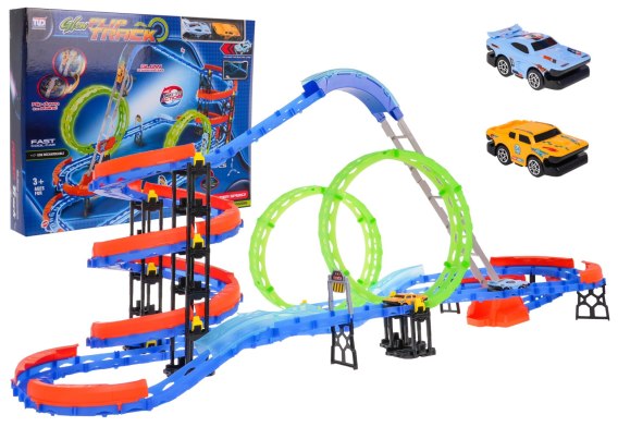 Duży, wielopoziomowy tor wyścigowy z drabinką, ostrymi zakrętami, pętlami i autkami to propozycja dla dzieci od 3-go roku życia. Zestaw składa się z 116 elementów do samodzielnego montażu i zawiera odcinki proste, ostre zakręty z barierkami zabezpieczającymi przed wypadaniem pojazdu z trasy, dwie pętle 360 stopni i drabinkę. Pętle dodatkowo są fluorescencyjne, świecą w ciemności. Pojazdy dołączone do zestawu są bardzo szybkie, od spodu posiadają podświetlane. Zasilane są akumulatorem 3,7 V, akumulator znajduje się w pojazdach. |