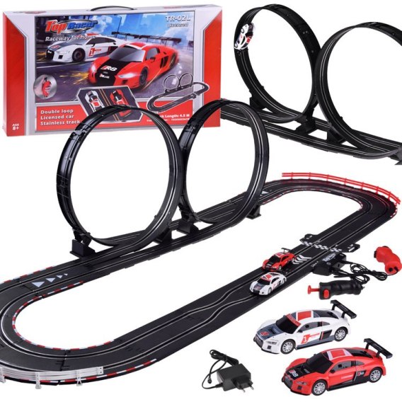 Długi wyścigowy tor samochodowy to marzenie każdego małego fana rajdów i wyścigów samochodowych. Tor o długości aż 4,5 m z dwoma autkami i ekstremalnymi pętlami zapewni mnóstwo emocji podczas zabawy. Dwa superszybkie autka na licencji Audi wykonane zostały z dbałością o szczegóły. Całość prezentuje się bardzo efektownie.