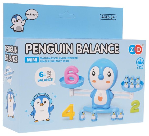 Gra zręcznościowa Waga Balansujący Pingwin dla dzieci od 3-go roku życia. Ta fascynująca gra, zapewni Twojemu dziecku, długie godziny edukacyjnej zabawy. Gra składa się z wagi szalkowej z uroczym pingwinem w środku odważników w postaci małych pingwinków i cyferek oraz karty z zadaniami matematycznymi. Po jednej stronie wagi układamy cyferki a po drugiej odpowiednią ilość pingwinów, tak aby zachować balans. Gra rozwija umiejętności dodawania, logiczne myślenie, wyobraźnie i kreatywność. Dziecko poznaje podstawy matematyki i fizyki.
