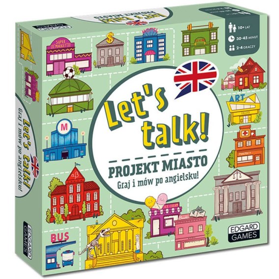 Let's talk. Projekt Miasto to gra do nauki angielskiego, w której możesz zostać mistrzem strategii. Zaplanuj trasę tak, aby jak najszybciej zrealizować tajny cel i ćwicz mówienie po angielsku. Pamiętaj, do zwycięstwa prowadzi wiele dróg i to od ciebie zależy, którą z nich wybierzesz. 64 miejsca na planszy to aż 128 powodów do gadania po angielsku! Odwiedź m.in. aptekę, teatr, kino, boisko, wykonuj polecenia i rozwijaj umiejętność swobodnej komunikacji w scenkach i dialogach w codziennych sytuacjach: z rówieśnikami i rodzeństwem.