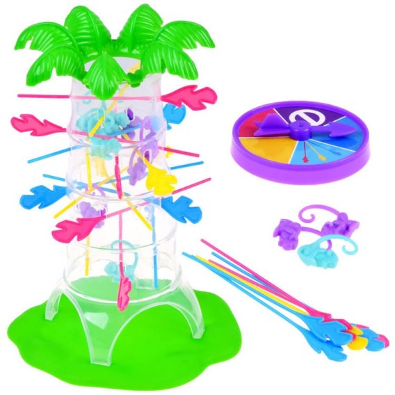 Bardzo popularna gra zręcznościowa Fikające Małpki to świetna propozycja zabawy dla najmłodszych. Gra dostarczy mnóstwo frajdy i radości. Jest łatwa do nauczenia i zabawna. Wymaga zręczności, koncentracji i umiejętności logicznego myślenia. Gra Fikające Małpki to wapniały sposób na spędzenie wspólnie czasu. Polega na tym, aby umieścić patyczki w otworach palmy i wsypać od góry małpki tak aby pozaczepiały się ogonkami na patyczkach. Następnie gracze kręcą po kolei strzałką i losują kolor kolor patyczka, którym mają wyciągnąć. Trzeba przy tym uważać, aby nie spadła ani jedna małpka. Wygrywa ten kto zbierze najmniej małpek! POWODZENIA!