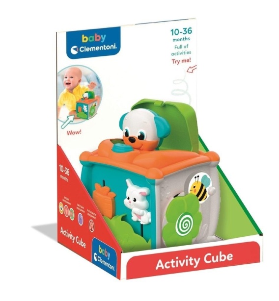 Kostka aktywności z wieloma czynnościami mechanicznymi. Zawiera aktywność z efektem Wow, którą można aktywować za pomocą przycisków, rolek, kół zębatych, itp. Zawiera też grzechotki i efekty dźwiękowe.