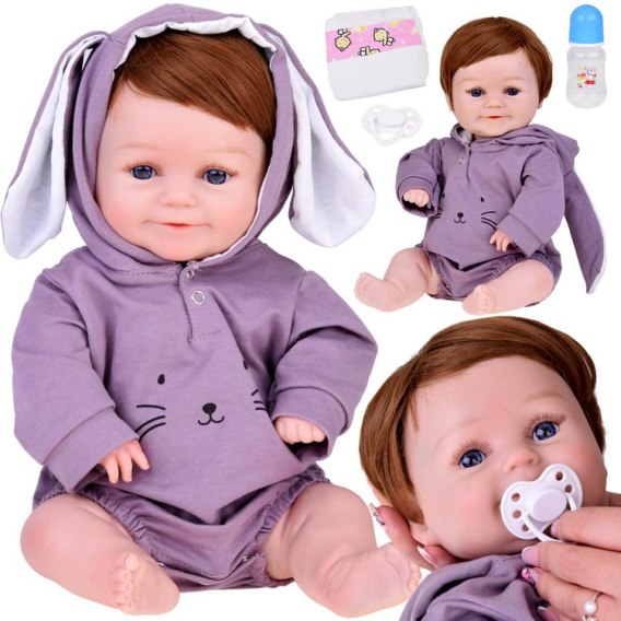 Śliczny niemowlak wykonany jest z miękkiej gumy, z dbałością o najdrobniejsze detale, jak urocze fałdki, czy realistycznie odwzorowane oczka. Chłopiec posiada gęste, brązowe włoski, które okalają sympatyczną buzię. Uwagę zwracają duże, niebieskie oczy, otoczone gęstymi rzęsami. Malutki nosek i uśmiechnięta buzia są dopełnieniem całości. Oczy lalki nie zamykają się.