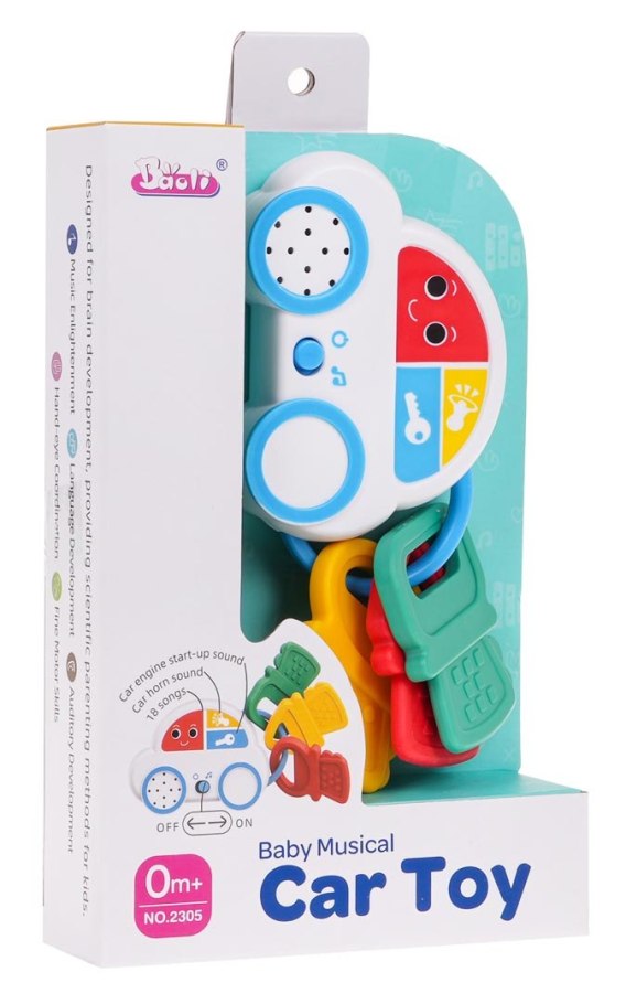 Interaktywne autko z kluczykami dla maluchów od 6-go miesiąca życia. Zabawka wykonana została z najlepszej jakości plastiku w żywych kolorach. Nie posiada ostrych zakończeń, jest w pełni bezpieczna dla maluszka. Kluczyki dołączone do autka mogą pełnić funkcję gryzaka. Autko zasilane jest bateriami typu 3 x AAA 1,5 V (brak w zestawie). Po naciśnięciu przez dziecko na przycisk z kluczem usłyszymy odgłos uruchamiania samochodu. Przycisk z klaksonem uruchamia odgłos klaksonu, a pod przyciskiem z buźką, kryje się 18 melodii. Funkcje zabawki: - odpowiednia dla maluchów od 6-go miesiąca życia, - bezpieczna, nie posiada ostrych krawędzi, - wykonana z najlepszej jakości plastiku w żywych kolorach, - kluczyki dołączone do autka pełnią funkcję gryzaczka, - efekty dźwiękowe: odgłosy uruchamiania pojazdu, odgłosy klaksonu, 18 melodii. |