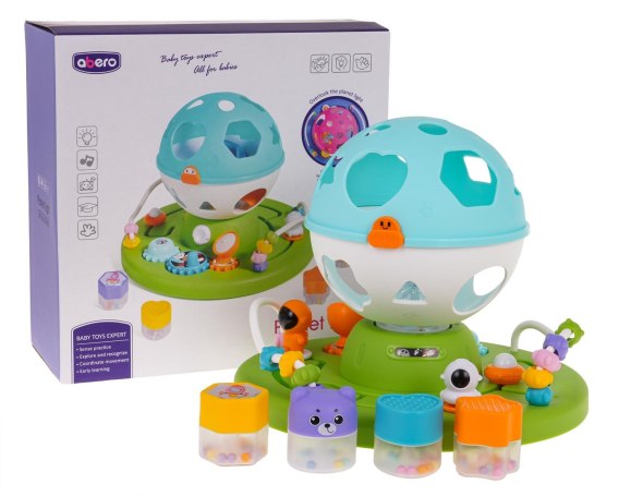 Interaktywny, edukacyjny, sorter o tematyce kosmosu dla maluszków od 18-go miesiąca życia. Sorter wykonany został z najlepszej jakości plastiku w żywych kolorach, przyciągających wzrok maluszka. Zabawka składa się z podstawki, na której  znajdują się kółeczka zębate do kręcenia, labirynty do pokonania i przekładanki. Na podstawce jest również okrągły sorter  z otworami w kształcie figur geometrycznych. Maluszek musi przypasować klocuszki znajdujące się w zestawie do odpowiednich kształtów na sorterze. Po dopasowaniu wszystkich klocków sorter można otworzyć i zabawę rozpocząć na nowo. W zestawie znajdują się 4 klocuszki. Dodatkowo każdy z nich w środku posiada małe kuleczki, które sprawiają, że klocuszek grzechocze. Sorter posiada również funkcję światła i dźwięku, z wnętrza kuli wydobywa się gwiezdny blask i słychać melodie. Zabawa tym sorterem uczy maluszka dopasowywać i kategoryzować według kształtu i koloru. Poprawia zdolności poznawcze i motoryczne. Dziecko poznaje przyczynę i skutek oraz doskonali umiejętności rozwiązywania problemu. Zabawka zasilana jest bateriami typu 3 x AA 1,5 V (brak w zestawie).
