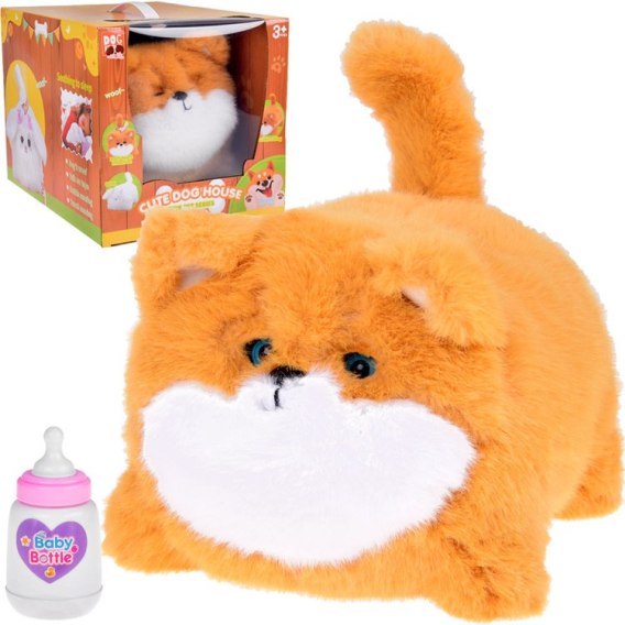 Szczekający piesek, pluszowa zabawka, mięciutki pies, milutki w dotyku, piesek, psi przyjaciel stworzony na wzór Shiba Inu i Akita Inu, rudy kolor zwierzaka, zwierzak domowy w zestawie z butelką