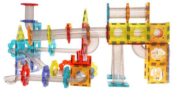 Zestaw kolorowych klocków magnetycznych dla dzieci od 3-go roku życia. Zestaw składa się z 176 elementów i pozwala na zbudowanie toru dla kulek o dowolnym układzie. Niektóre elementy zestawu zasilane są bateriami, a po włączeniu ich rozświetlają tor pulsującymi światłami, a zabawa robi się ciekawsza. Światełka pulsują w 3 trybach: szybkim, średnio szybkim i wolnym, można wybrać, który tryb będzie dla dziecka odpowiedni. Dodatkowo kilka kulek po potrząśnięciu mruga światełkami. W zestawie mamy też kilka kolorowych kapsuł, które świecą się i zmieniają kolory oraz kilka reflektorów LED. W sumie zestaw zasilany jest bateriami typu 12 x LR1130, 6 x LR41 oraz 8 x CR1220. Wszystkie baterie znajdują się w zestawie. Klocki wykonane zostały z najlepszej jakości tworzywa, są gładkie i starannie wykonane. Łączymy je ze sobą za pomocą wbudowanych magnesów. Magnesy bardzo dobrze trzymają, zapewniając stabilność konstrukcji. W zestawie znajduje się obrazkowa instrukcja złożenia przykładowych torów. |