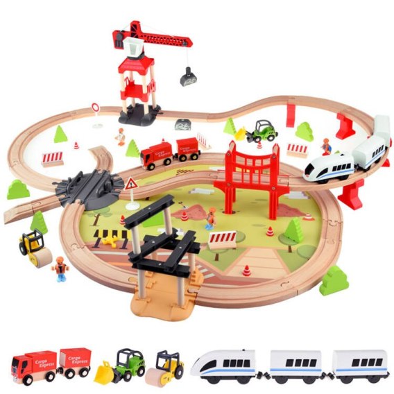 Drewniany zestaw z kolejką to ponadczasowa wspaniała zabawka, która z pewnością ucieszy każde dziecko. Ten wieloelementowy zestaw składa się z około 100 różnych drewnianych oraz plastikowych części i akcesoriów, które posłużą do zbudowania świetnej bazy transportowej z torami i miejscem do przeładunku towarów. W zestawie znajdują się pojazdy: koparka, walec, ciężarówka z naczepą oraz możliwością dokładania załadunku w kontenerach oraz plastikowa kolejka z dwoma wagonami, które są łączone za pomocą magnesów. Atrakcją zestawu jest to, że po zamontowaniu baterii pociąg jeździ po torach i ma możliwość jazdy w przód lub w tył. Znajdziemy tutaj też: figurki ludzi, znaki drogowe, krzewy, plastikowe elementy do budowy wiaduktu oraz elementy do zbudowania dźwigu.