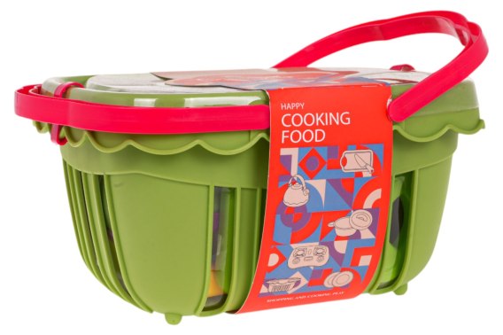 Koszyk z akcesoriami dla dzieci od 3-go roku życia. W zestawie znajduje się koszyk piknikowy, garnek z pokrywką, deska do krojenia warzyw i owoców, nóż, patelnia, talerzyki, kubki oraz atrapy warzyw i owoców na rzepy. Idealny sposób na zabawę na zewnątrz.