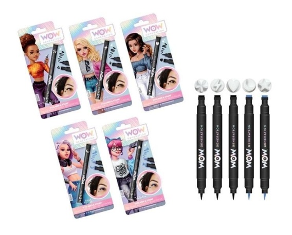 Kredka do oczu ze stemplami do ozdabiania twarzy - WOW Generationto wspaniała propozycja dla każdej małej dziewczynki.Eyliner i stempel są idealne do uzupełnienia prostego makijażu Twojej córki.Nie potrzeba wiele, aby się wyróżniać, dlatego eyliner ze stemplem jest idealny, aby Twoje dziecko wygladało jak jedna z dziewczyn WOW.Eyelinery są bardzo cienkie i z domieszką koloru, czarne lub niebieskie.Stemple dostępne są w kształatach błyskawica serce gwiazga