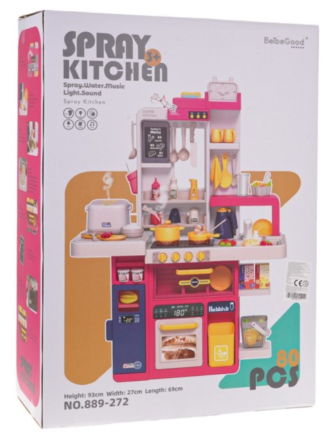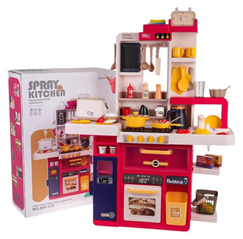 Interaktywna kuchnia z funkcją światła, pary wodnej, dźwięku i kranikiem, z którego wydobywa się woda, a także mnóstwem akcesoriów, dla dzieci od 3-go roku życia. Kuchnia została znakomicie wykonana, z najlepszej jakości plastiku i jest w żywych kolorach zachęcających dziecko do zabawy. Na blacie kuchni znajduje się interaktywna płyta z palnikami. Po przekręceniu jednego z pokręteł słychać odgłosy gotowania, a drugiego, odgłosy smażenia. Odgłosom gotowania i smażenia towarzyszy podświetlenie palników. Dodatkowo z patelni lub garnka wydobywa się para wodna. Z kranu faktycznie wypływa woda, jak w prawdziwym zlewie, dziecko będzie mogło umyć zabawkowe naczynia. Do zestawu dołączono również tablicę kredową, na której można przygotować np. przepis lub listę na zakupy. W zestawie mamy też atrapę lodówki z otwieranymi drzwiczkami, otwierany piekarnik oraz mnóstwo półeczek, na których ułożyć możemy atrapy produktów. Na górze zestawu kuchennego znajduje się panelik muzyczny z przyciskami uruchamiającymi różne melodie I odgłosy wydawane przez okap. W zestawie znaleźć możemy również pojemnik do gotowania ryżu, z którego wydobywa się bezpieczna para wodna oraz słychać różne odgłosy gotowania. Cały zestaw prezentuje się znakomicie. Cały zestaw zasilany jest bateriami typu 9 x AA 1,5 V (brak w zestawie). Funkcje zestawu: - odpowiednia dla dzieci od 3-go roku życia, - wykonana z najlepszej jakości plastiku w żywych kolorach, - bogato wyposażona, zestaw składa się aż z 80 elementów, - ruchome pokrętła, - palniki z podświetleniem, - odgłosy smażenia i gotowania, - z patelni lub garnka wydobywa się bezpieczna para wodna, - z pojemnika do gotowania ryżu wydobywa się bezpieczna para wodna i słychać odgłosy gotowania, - kran z lecącą wodą, - otwierana lodówka, - otwierany piekarnik, - otwierana półka, - zegar z ruchomymi wskazówkami, - tablica kredowa, - panelik z melodiami i odgłosami wydawanymi przez okap. |