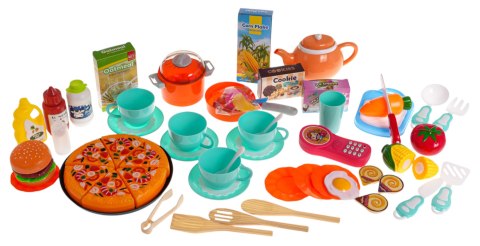 - kuchnia, - telefonik, - 4 x karty z przepisami kucharskimi, - deska do krojenia, - garnek głęboki z pokrywką, - patelnia, - czajnik z pokrywką, - chochla, - widelec, - łopatka, - nóż większy i mniejszym - szpatułka, - łyżka, - 2 x łyżeczka, - łyżka cedzakowa, - 2 x łyżeczki, - kubeczek, - 4 x filiżanka, - 4 x talerze, - 4 x talerzyk, - szczypce, - 3 x kapsułki z kawą, - butelka na ketchup, - butelka na mleko, - butelka na olej, - 2 x płatki kukurydziane w pudełku, - kartonik z lodami, - kartonik z ciasteczkami, - atrapy produktów: pomidor na rzepy, kukurydza na rzepy, marchewka na rzepy, jajko sadzone, pizza (6 kawałków na rzepy), ryba, krab, hamburger z sałatą i mięsem na rzepy, - taca do grillowania, - pipetka na wodę, - naklejki dekoracyjne. |