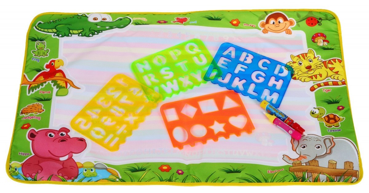 | - duża rozkładana mata wodna, - 2 pisaki wodne, - 4 nakładki z szablonami do rysowania (literki, numerki, figury geometryczne), - instrukcja. |