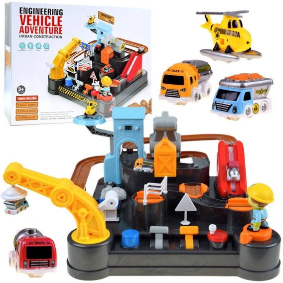 Za pomocą pomarańczowego kołowrotka autka zostają przeprowadzone przez wszystkie zakręty. Czerwony kołowrotek umożliwi wyciągnięcie pojazdu na wyższy poziom, a za pomocą żółtej dźwigni można podnieść windę. Popielata dźwignia uniesie znak w górę, a niebieski przycisk spowoduje, że autko zostanie wyrzucone w górę i umieszczone na magnesie na żółtym żurawiu. Nad całą trasą czuwa inżynier budownictwa. Tor wyposażony jest w trzy budowlane autka takie jak wywrotka, betoniarka, beczkowóz oraz helikopter. Zabawka posiada wieżę na której został umieszczony cyfrowy zegar na baterie, dzięki któremu nasz budowniczy będzie mógł zmierzyć czas przebytej trasy, ale to nie wszystko po włączeniu zegara wydobywa się wesoła melodia. Zestaw wykonany jest w całości z plastiku, należy go samodzielnie złożyć i zacząć wesołą zabawę.