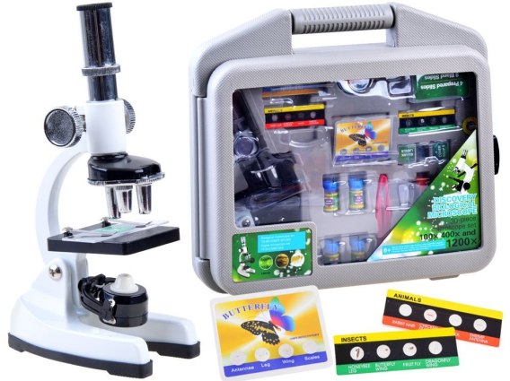 Edukacyjny zestaw dla małego naukowca składający się z mikroskopu z akcesoriami, to świetny sposób na wprowadzenie dziecka do świata nauki i przyrody. Pozwoli na zobaczenie tego, czego nie można dostrzec gołym okiem. Mikroskop został wykonany z metalu w połączeniu z plastikiem bardzo starannie i z dbałością o szczegóły. Mikroskop posiada obracaną głowicę z 3 soczewkami, które dają powiększenie 100x/600x/1200x oraz wbudowaną żarówkę do podświetlania oglądanych preparatów.