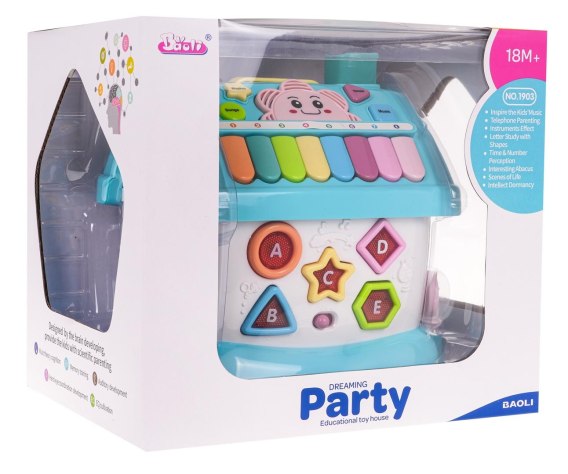 Interaktywny, edukacyjny domek dla dzieci od 18-go miesiąca życia. Domek wykonany został z najlepszej jakości plastiku, w żywych kolorach, przyciągających wzrok dziecka i zachęcających do edukacyjnej zabawy. Domek posiada 4 ściany oferujące różne atrakcje, różowy daszek oraz rączkę do przenoszenia. Zabawka zasilana jest bateriami typu 3 x AA 1,5 V (brak w zestawie). Do zestawu dołączone jest również niebieskie autko. Ścianka z drzwiami garażowymi i zegarem. Na tej ścianie znajduje się zegar z ruchomymi wskazówkami i otwieranymi drzwiami do garażu. Po otwarciu garażu wyjeżdża ze środka różowy samochodzik (dołączony do zestawu). Ścianka z alfabetem Na tej ściance znajduje się włącznik i wyłącznik z regulacją głośności. W różnokolorowych figurach geometrycznych umieszczono litery: A, B, C, D, E. Po naciśnięciu raz na literkę usłyszymy jej nazwę w języku angielskim. Po ponownym naciśnięciu usłyszymy nazwę figury geometrycznej. Podczas naciskania, figura się podświetla. Ścianka z drzwiami wejściowymi Drzwi otwierają się za pomocą klucza znajdującego się obok nich. Kluczyk dodatkowo posiada sznureczek i jest przymocowany do ściany, żeby nie zaginął. Na tej ściance znajduje się również lampa z podświetleniem oraz odgłosami dzwonka i zamykanych drzwi. Ścianka z obrotowymi elementami Na tej ściance mamy 5 obrotowych elementów z rysunkami i numerkami oraz 9 obrotowych kółeczek. Dach domku Na dachu domku znajduje się z jednej strony wyjmowany telefonik, a obok niego klawiatura numeryczna z odgłosami dzwonków i nazwami liczb. Z drugiej organki z ośmioma kolorowymi klawiszami, słoneczkiem i przyciskami muzycznymi. Na pianinku malec może grać nuty. Za pomocą przycisku z tonami możemy zmieniać brzmienie pianinka. Mamy również przycisk z różnymi rytmami, z piosenkami i muzyką. Na dachu domku znajduje się również wysuwana rączka do przenoszenia zabawki, kółko z podświetleniem oraz wciskany komin. Po naciśnięciu komina z okienko otwiera się i słyszymy dźwięk ptaszka. Funkcje zestawu: - przeznaczony dla dzieci powyżej 18-go miesiąca życia, - wykonany z najlepszej jakości plastiku w żywych kolorach, - funkcje dźwiękowe: odgłos grzechotania przy przesuwaniu wskazówek zegara, nazwy literek, odgłosy dzwonków, odgłosy wybierania tonowego, śpiew ptaszka, odgłos dzwonków i zamykania drzwi, nazwy figur geometrycznych i liczb, nuty, tony, rytmy, piosenki, muzyka. - funkcje świetlne: lampka przed drzwiami wejściowymi, kółko na dachu, figury geometryczne, - uczy nazw figur geometrycznych, liczb, liter, ćwiczy małe rączki, - każda ze ścianek oferuje inne atrakcje, - organki i telefonik na dachu domku - ruchome elementy: otwierane drzwi wejściowe i brama garażowa, wyjmowany telefon, przekładanka, obrotowe kółeczka. - wygodna rączka do przenoszenia, - samochodzik w zestawie. |