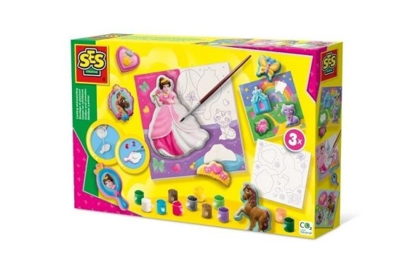 Twórz trójwymiarowe obrazy księżniczek! Dzięki temu pięknemu, obszernemu zestawowi do odlewów gipsowych można odlewać figurki księżniczek i malować je na pięknych, wytrzymałych płótnach. Wystarczy wlać gips w dołączone formy i przykleić je w odpowiednich miejscach na płótnie. Zarysowane motywy ułatwiają malowanie. Zarówno farba, jak i tynk są łatwo zmywalne z tkanin i skóry.