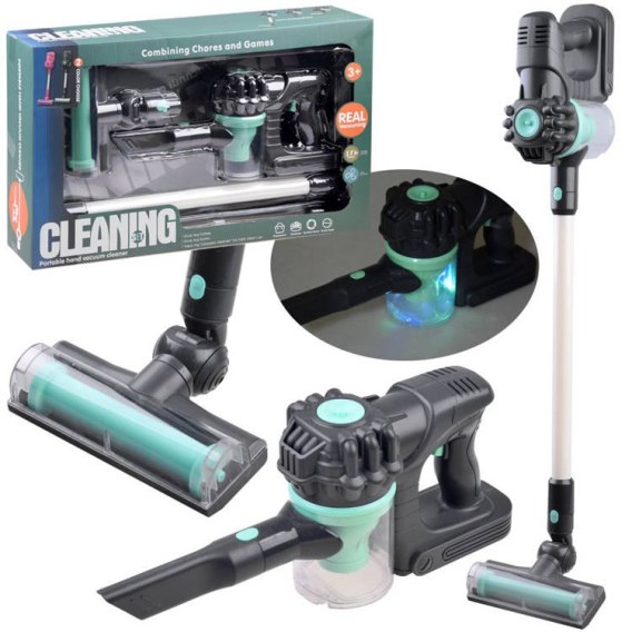 Zestaw w całości wykonany z plastiku w eleganckim szaro zielonym kolorze. Zabawka posiada dwie wymienne końcówki, podczas pracy świeci kolorowym światełkiem. Kubełek na kurz jest otwierany, dzięki czemu można wysypać zaciągnięte śmieci.