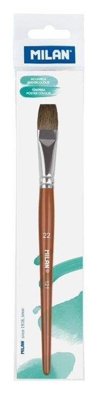 Szkolny płaski pędzel serii 121 nr 22 z krótkim drewnianym trzonkiem. Skład: 70% naturalnego włosia koziego + 30% syntetyczne. Brązowe lakierowane wykończenie i aluminiowa skuwka bez spawania, odporna na rdzewienie. Bardzo miękkie włosie idealne do technik akwarelowych, wodnych i plakatowych. Lepsze zatrzymanie wody i farby. Gładsza linia. Lepsza odporność i elastyczność, co ułatwia odzyskanie kształtu po jego użyciu. Szerokość włosia: 16,1 mm. Grubość włosia: 4,2 mm. Długość włosia: 19,4 mm. Długość pędzla: 202 mm.