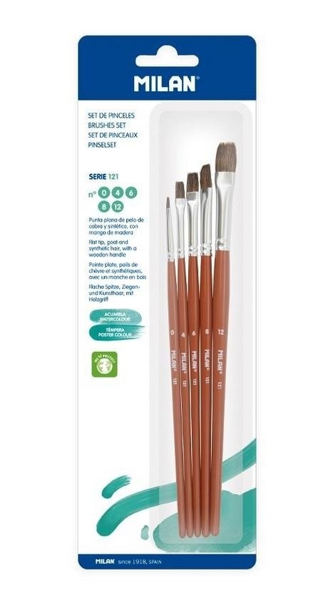 Zestaw 5 szt. pędzli szkolny płaskich z serii 121 nr 0, 4, 6, 8 i 12 z krótkim drewnianym trzonkiem. Skład: 70% naturalnego włosia koziego + 30% syntetyczne. Brązowe lakierowane wykończenie i aluminiowa skuwka bez spawania, odporna na rdzewienie. Bardzo miękkie włosie idealne do technik akwarelowych, wodnych i plakatowych. Lepsze zatrzymanie wody i farby. Gładsza linia. Lepsza odporność i elastyczność, co ułatwia odzyskanie kształtu po jego użyciu.