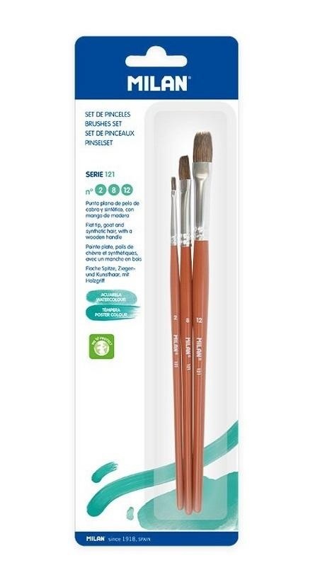 Zestaw 3 szt. pędzli szkolny płaskich z serii 121 nr 2, 8 i 12 z krótkim drewnianym trzonkiem. Skład: 70% naturalnego włosia koziego + 30% syntetyczne. Brązowe lakierowane wykończenie i aluminiowa skuwka bez spawania, odporna na rdzewienie. Bardzo miękkie włosie idealne do technik akwarelowych, wodnych i plakatowych. Lepsze zatrzymanie wody i farby. Gładsza linia. Lepsza odporność i elastyczność, co ułatwia odzyskanie kształtu po jego użyciu.
