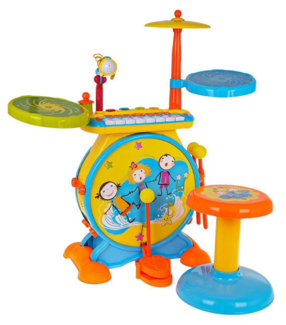 - 3 bębnowa perkusja ze stopką, - talerz, - mikrofon, - keyborad, - dwie pałeczki z gumowymi końcami, - stołeczek. |