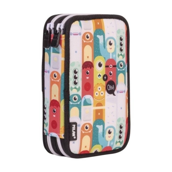 Piórnik 2-poziomowy z wyposażeniem, idealny do przechowywania przyborów szkolnych w uporządkowany i łatwo dostępny sposób. Specjalna seria Aliens, z wesołym wielokolorowym wzorem ułożonych kosmitów, te same postacie co w drewnianej zabawce "Wieża kosmitów", z czarną wewnętrzną podszewką. Zawartość zestawu: 2 gumki (4024 i Nata niebieska 7024B), 1 temperówka AFILA, 1 sześciokątny ołówek grafitowy HB, 1 długopis z niebieskim tuszem P1 Look, 1 trójkątna linijka 15 cm, 12 trójkątnych kolorowych kredeki 18 flamastrów ze stożkową końcówką. Materiał zewnętrzny i wewnętrzny 100% poliester. Wymiary: 19,5 x 13 x 5 cm.