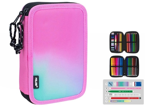 Piónik 2 - poziomowy z wyposażeniem z kolekcji SUNSET w kolorze różowym. Połączenie gradientowych kolorów inspirowanych zachodem słońca z czarno-białymi detalami. Wyposażenie: 12 kredek trójkątnych, 18 flamastrów ze stożkową końcówką, długopis COMPACT SUNSET niebieski, ołówek sześciokątny HB, linijka trójkątna 15 cm, temperówka kwadratowa AFILA, 2 gumki 4024 i 320SN. Każdy poziom osobno zapinany na suwak. Przy produkcji piórników użyto najlepszych materiałów, bardzo wytrzymałych suwaków oraz wzmocnionych nici. Niepowtarzalne wzornictwo. Tkanina zewnętrzna Ripstop: lekka i odporna na rozdarcia. Wykorzystuje specjalną technikę, która tka grube, wzmacniane nici w regularnych odstępach, tworząc wzór krzyżowy. Materiał zewnętrzny i wewnętrzny 100% poliester. Rozmiar piórnika: 19,5 x 13 x 5 cm. W piórnikach znajdziesz min.: kredki MILAN przy produkcji których użyto drewna pochodzącego wyłącznie z plantacji, gwarantujących nie używanie drewna z lasów deszczowych. Rysik kredki na całej długości jest przyklejony do drewna co zapobiega jego łamaniu. Dzięki trójkątnej budowie kredka jest ergonomiczna i wygodnie trzyma się dziecku. Flamastry MILAN posiadają wytrzymałą i elastyczną stożkową końcówką, która nie wpada do środka nawet przy silnym nacisku. Po chwilowym odkształceniu końcówka zawsze wraca do pierwotnego kształtu. Tusz na bazie wody. Flamastry nie zawierają ftalanów, metali ciężkich i innych. Temperówkę z bezpiecznym przykręconym ostrzem dzięki czemu ostrze nie oddzieli się od obudowy temperówki. Gumkę z naturalnym kauczukiem.