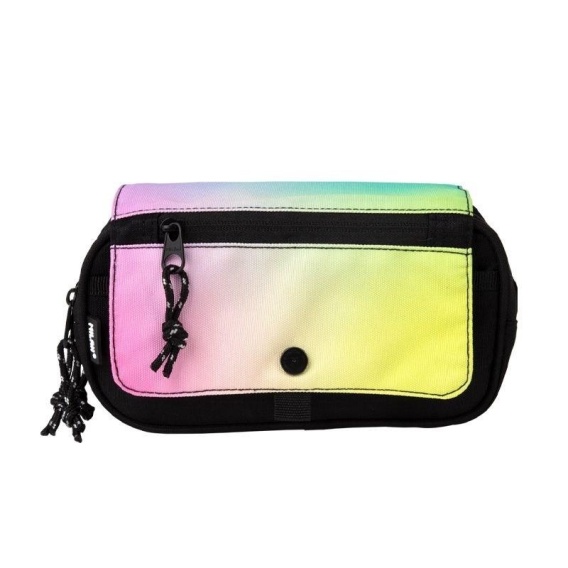Piórnik saszetka z 3 przegrodami zapinanymi na suwak i małą kieszonką z przodu na klapie. Seria SUNSET czarno-tęczowej tonacji. Połączenie gradientowych kolorów inspirowanych zachodem słońca z czarnymi detalami. Tkanina zewnętrzna Ripstop: lekka i odporna na rozdarcia, ponieważ wykorzystuje specjalną technikę, która splata grube, wzmacniające nici w regularnych odstępach, tworząc krzyżowy wzór. Materiał zewnętrzny i wewnętrzny 100% poliester. Wymiary: 13 x 24 x 10 cm.