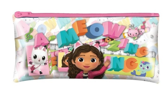 Piórnik Gabby's Dollhouse z najfajniejszymi postaciami. Ten piórnik zawiera cztery niezbędne elementy, abyś mógł zacząć: Ołówek, Temperówka, Gumka, Linijka 15cm.