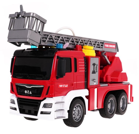 Interaktywna straż pożarna z funkcją wody dla dzieci od 3-go roku życia. Straż wykonana została z najlepszej jakości plastiku w żywych kolorach. Posiada gumowe opony, dobrze trzymające się podłoża oraz napęd Friction. Na górze auta strażackiego znajdują się przyciski odpowiedzialne za generowanie dźwięków syren, odgłosów odpalania pojazdu oraz pracy silnika. Po bokach przycisków dźwiękowych są też świecące światełka. Drabinę wozu strażackiego możemy podnosić i opuszczać oraz wysuwać do przodu (manualnie). Po napełnieniu zbiorniczka znajdującego się przy kabinie pojazdu wodą i naciśnięciu pompki z węża będzie wydobywać się woda. Zabawka zasilana jest bateriami typu 3 x AG13 (w zestawie).