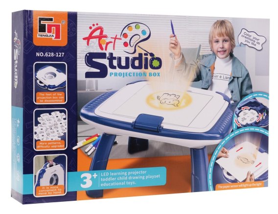 Projektor do malowania dla dzieci od 3-go roku życia. Projektor zaprojektowano w kształcie stoliczka. Zestaw zawiera 12 krążków z 4 slajdami. Wystarczy włożyć krążek i kolorowy slajd pojawi się na górze stoliczka do malowania. Następnie dziecko kładzie kartkę na stoliczku i obrysowuje wyświetlany obrazek. W zestawie znajdują się również kolorowe pisaki do malowania.  Zabawka zasilana jest bateriami typu 3 x AA 1,5 V (brak w zestawie).