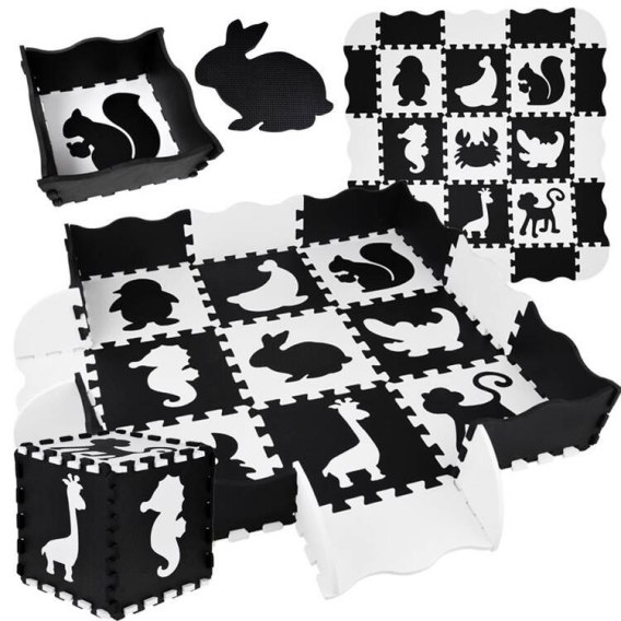 Duża mata piankowa dla dzieci składająca się z 16 miękkich puzzli w kontrastowych odcieniach czerni i bieli. Dzięki swojej nowoczesnej, neutralnej kolorystyce idealnie sprawdzi się w każdym dziecięcym pokoju, a kontrastowe barwy przyciągną uwagę najmłodszych i stymulują rozwój wzroku u niemowląt.