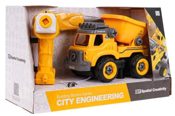 Interaktywny pojazd budowlany dla dzieci od 3-go roku życia z akcesoriami w zestawie. Pojazd otrzymujemy skręcony i kompletny, możemy go rozłożyć na części pierwsze za pomocą dołączonego do zestawu śrubokręta lub wkrętarko wiertarki. Śrubokręt jest manualny, natomiast wkrętarko wiertarka jest na baterie. Wiertarka posiada wyjmowany panel, jeżeli przełożymy ten panel do pojazdu, możemy go sterować do przodu i do tyłu. Panel posiada również możliwość ustawienia, by pojazd jeździł sam do przodu albo do tyłu. Pojazd budowlany ponadto posiada efekty dźwiękowe w postaci odgłosów silnika, jazdy i klaksonu oraz ruchome elementy takie jak przyczepa czy dach pojazdu. Zabawka wykonana została z najlepszej jakości materiałów, w żywych kolorach. Panel sterujący zasilany jest bateriami typu 2 x AA 1,5 V (brak w zestawie), autko bateriami typu 3 x AG13 (w zestawie). Funkcje zestawu: - przeznaczony dla dzieci od 3-go roku życia, - wykonany z solidnych materiałów, - żywe kolory przyciągają wzrok dziecka, - pojazd możemy rozłożyć na części pierwsze za pomocą śrubokręta lub wkrętarko-wiertarki, - pojazd budowlany jeździ sam do przodu lub tyłu po włożeniu panelu zasilającego, - może być sterowany pilotem 2,4 GHz, do przodu lub tyłu, - wkrętarko-wiertarka na baterie, wkręca i wykręca, - efekty dźwiękowe w pojeździe: klakson, odgłos silnika, odgłos jazdy, - podnoszona przyczepa, podnoszony dach pojazdu, - gumowe opony w pojeździe. |