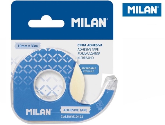 Taśma MILAN samoprzylepna niewidoczna krystaliczna 19 mm x 33 m na dyspenserze z metalowym ostrzem wielokrotnego użytku. Bardzo dobrze trzyma. Nie żółknie z czasem. Średnica taśmy 5,5 cm.
