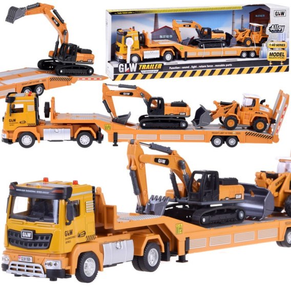 Zestaw ten to idealny prezent dla każdego dziecka, które uwielbia bawić się maszynami budowlanymi. Samochód budowlany - ciągnik przeznaczony do ciągnięcia lawety. Wyposażony został w dźwięk odpalanego pojazdu, cofania, klakson oraz efekty świetlne, takie jak: świecące światła z przodu oraz migające koguty na dachu samochodu. A wszystko to dzieje się po naciśnięciu pojazdu!