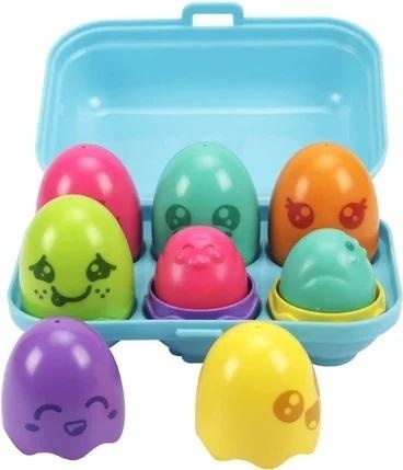 Sześć jajeczek, wewnątrz których kryją się wesołe pisklaki. Dzieci usłyszą radosne ćwierkanie wciskając ich główki. Różne kształty umieszczone na spodzie pudełka służą jako sorter.