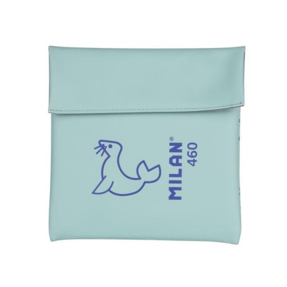 Mała izotermiczna torba na kanapki i przekąski. Kolor zielony z granatowym wzorem foki. Kolekcja 460 inspirowana oryginalnymi kolorami i wzornictwem gumek MILAN, produkowanych w Hiszpanii od 1918 roku. Wnętrze izolowane termicznie (zimno/gorąco) dla lepszego przechowywania żywności. Skład materiału: 100% poliuretanowa tkanina zewnętrzna i 100% izotermiczna podszewka wewnętrzna (P.E.V.A.). Wymiary: 18,5 x 18,5 x 1,3 cm Pojemność: 0,30 L.