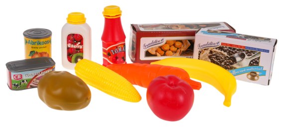 - koszyk z rączką i uchwytem, - banan, - marchewka, - kukurydza, - ziemniak, - pomidor, - ketchup, - konserwa, - sok owocowy, - pudełko ciastek, - pudełko z kawą, - puszka z brzoskwiniami. |