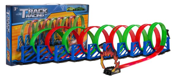 Tor wyścigowy z wyrzutnią i 9 pętlami 360 stopni, dla dzieci od 3-go roku życia. Tor wykonano z najlepszej jakości plastiku w żywych kolorach. Tor posiada odcinek prosty do rozpędzenia pojazdu, 9 pętli 360 stopni, wyrzutnię i dwa pojazdy. Pojazdy napędzane są napędem pull back. Wystarczy delikatnie nacisnąć pojazd do tyłu, by przejechał tor z pełną mocą.