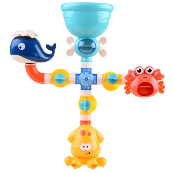 Wodę wlewamy od góry do zabawki, wówczas wędruje ona w środku a następnie wylatuje otworami tworząc fontannę lub wodospad. Dzięki zamontowanym lejkom, wlewanie wody jest łatwe i przyjemne. Fontanna wykonana z bezpiecznych materiałów, kolorowa zabawka uatrakcyjni codzienną kąpiel i zachęci do zabawy każdego malucha. Kształty morskich zwierząt ośmiornicy, wieloryba i kraba nadają zabawce morskiego klimatu. Dzieci uwielbiają montować, rozbierać i tworzyć różne kombinacje. Ta zabawka do kąpieli jest łatwa w montażu i demontażu i pozwala stworzyć wiele różnych kombinacji do zabawy. Można zamieniać rozmieszczenie zwierzątek, odłączać poszczególne rurki lub za pomocą żółtych pokrętełek zamykać lub otwierać dopływ wody.